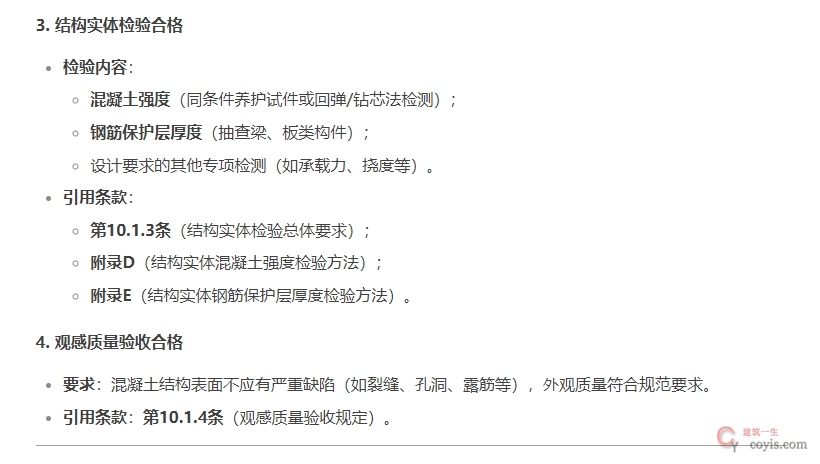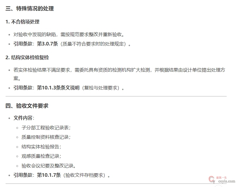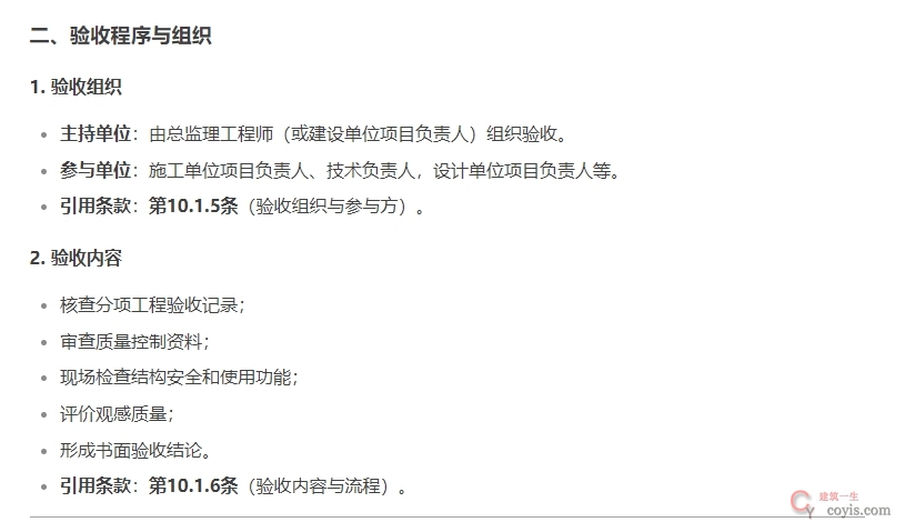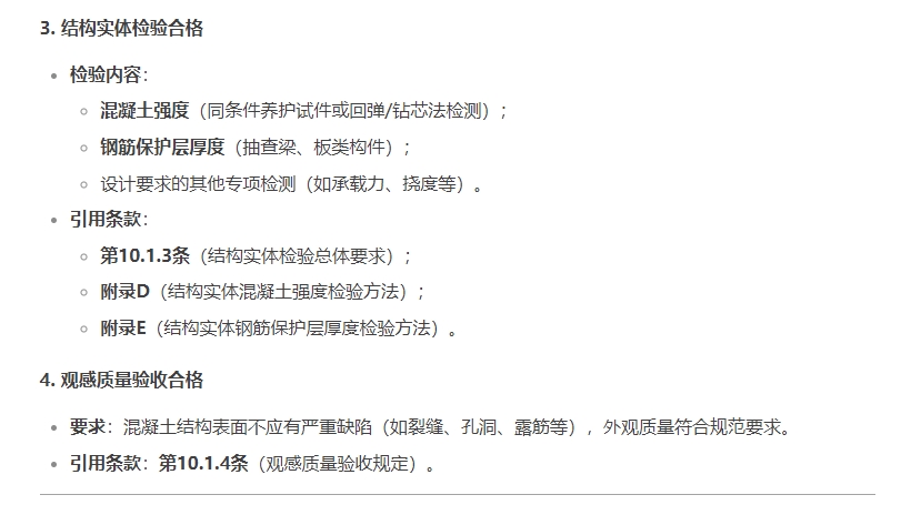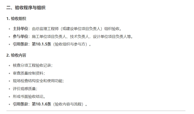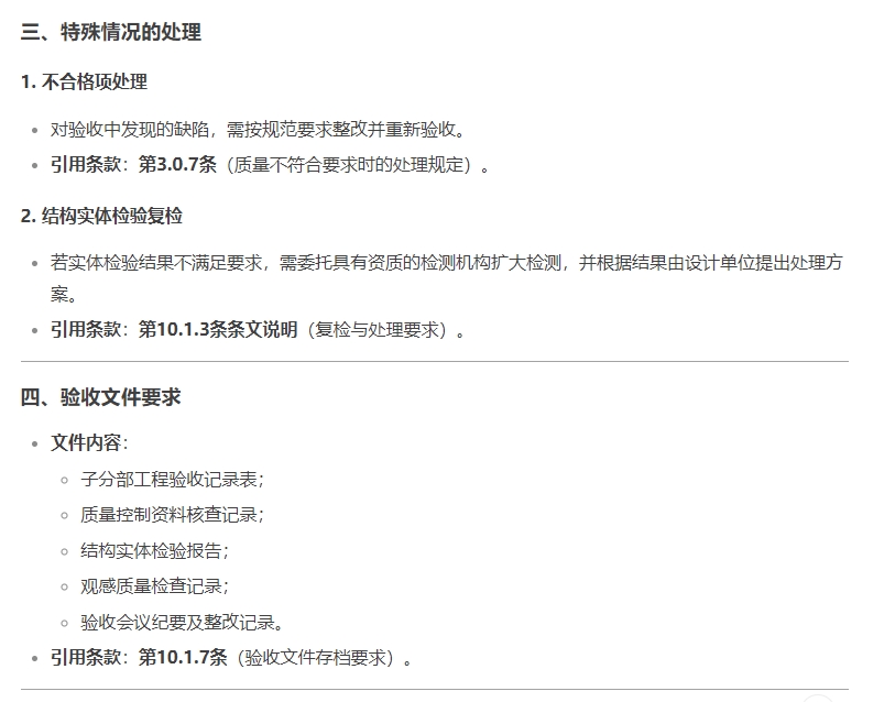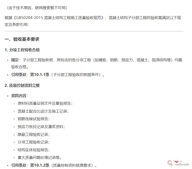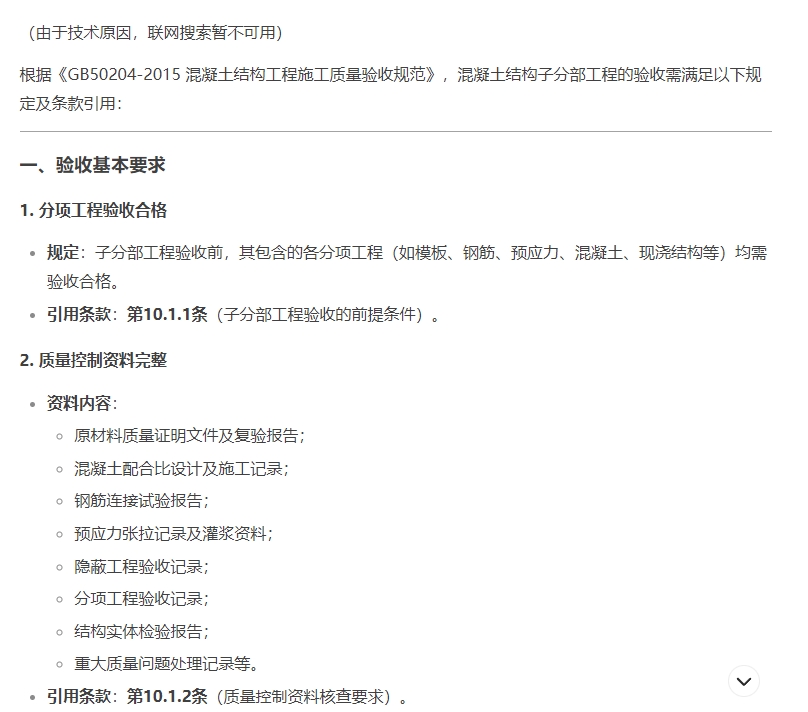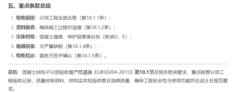总结:混凝土结构子分部验收需严格遵循《GB50204-2015》第10.1节及相关附录要求,重点核查分项工程验收记录、质量控制资料、结构实体检验结果及观感质量,确保工程安全性与使用功能符合设计及规范要求。 |