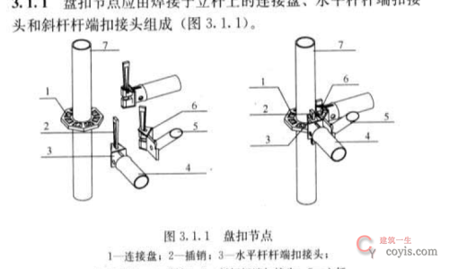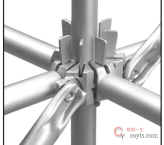 4、盘扣节点:支架立杆上的连接盘与水平杆、斜杆杆端上的插销连接的部位。