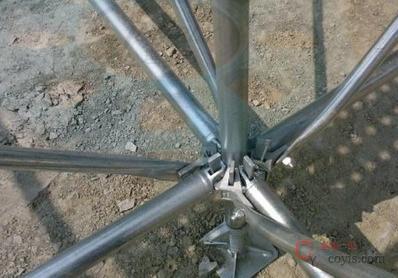 3、连接盘:焊接于立杆上可扣接8个方向扣接头的八边形或圆形孔板。