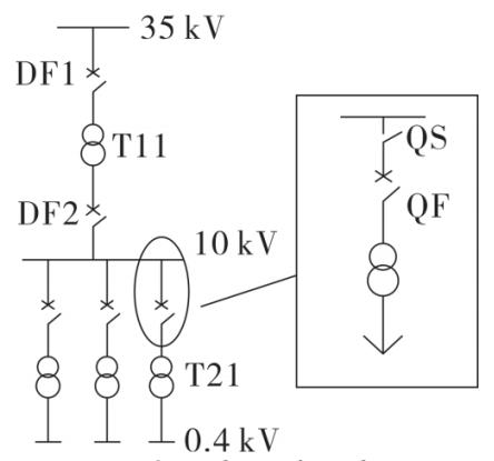 某安装公司承按一工业园区的变配电工程(35kV 变电站、10kV 变电所),进线电压为35kV,变配电系统为二级变电(如下图所示),主要设备:三相油浸式电力变压器(6300kVA,35kV/10kV)、三相干式电力变压器(1250kVA,10kV/0.4kV),断路器、隔离开关、各类电器及柜体等。