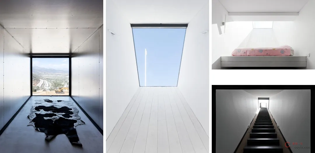 箱体拼接后营造出富有戏剧性透视效果的室内空间,既巧妙利用空间,又保留集装箱整体结构性能,建筑随着地形跌落起伏,整体上宛如一个山地聚落。