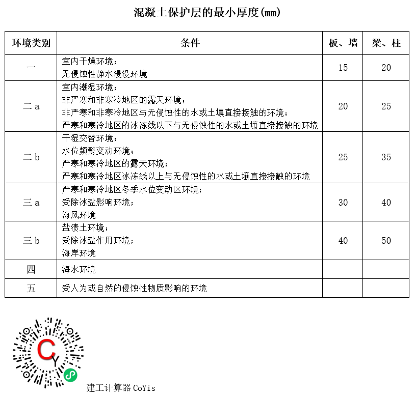 注:1.表中混凝土保护层厚度指最外层钢筋外边缘至混凝土表面的距离,适用于设计工作年限50年的混凝土结构。【小编注:具体可参考上面定义】