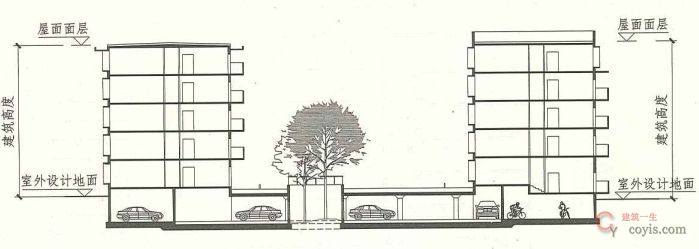 4、对于台阶式地坪,当位于不同高程地坪上的同一建筑之间有防火墙分隔,各自有符合规范规定的安全出口,且可沿建筑的两个长边设置贯通式或尽头式消防车道时,可分别计算各自的建筑高度。否则,应按其中建筑高度最大者确定该建筑的高度。如图所示: