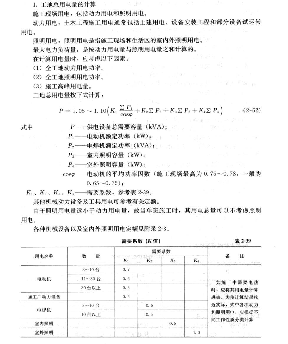 P=1.05×(K1∑P1cosφ+K2∑P2+K3∑P3+K4∑P4)