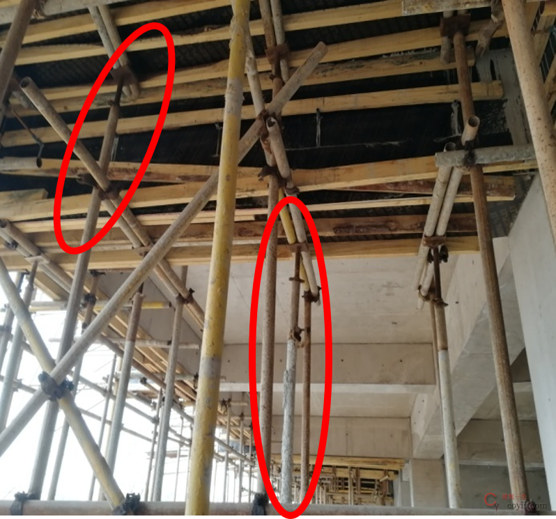 模架体系缺少一个方向或两个方向顶部小横杆,导致自由端超高;个别项目模架立杆部分悬空。