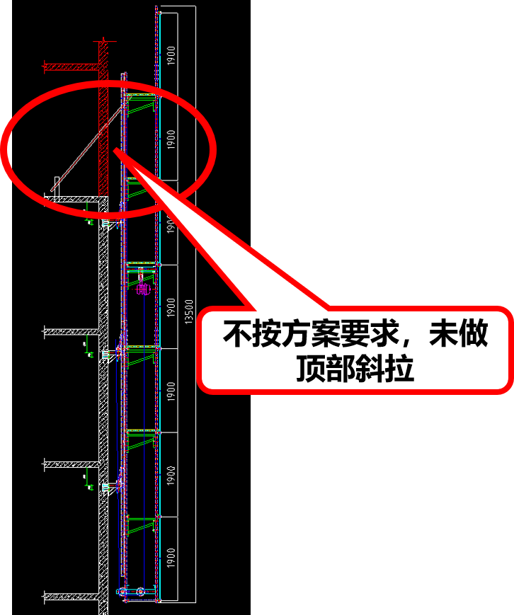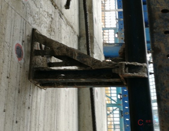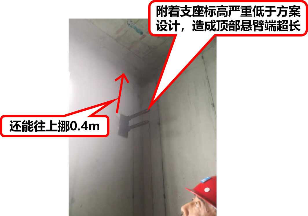 附着预埋螺杆数量与方案不符,方案为六根螺杆,实际为四根。附着螺栓边缘混凝土太薄,不能有效固定附着支座
