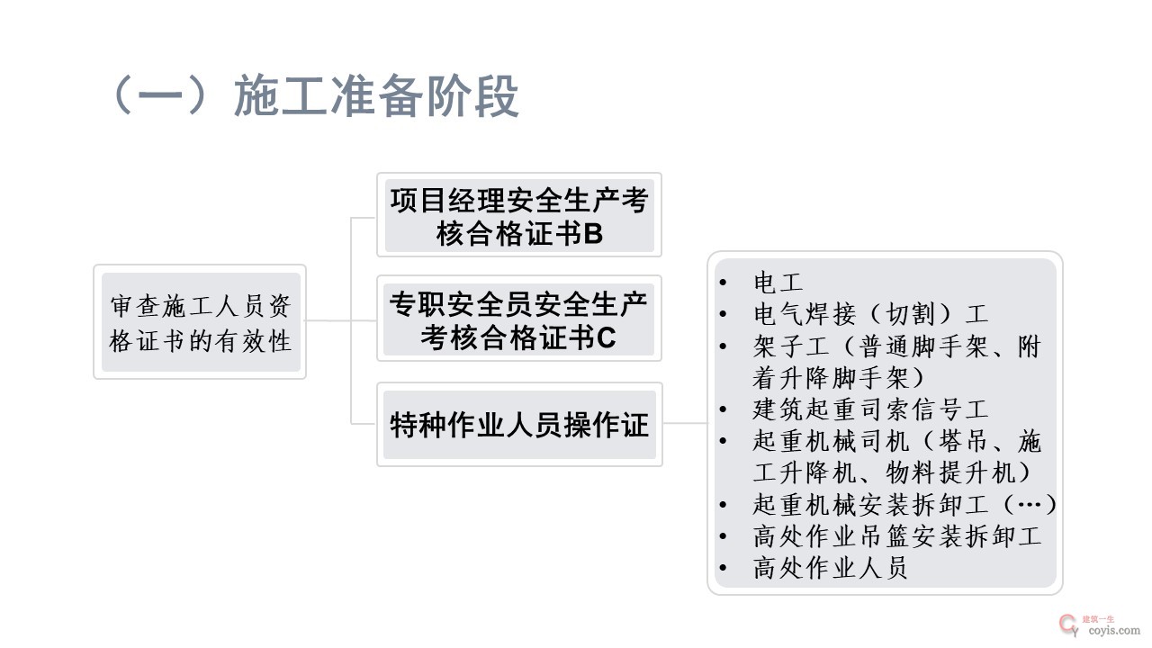 ①施工单位专职安全生产管理人员到岗情况和特种作业人员持证上岗情况;