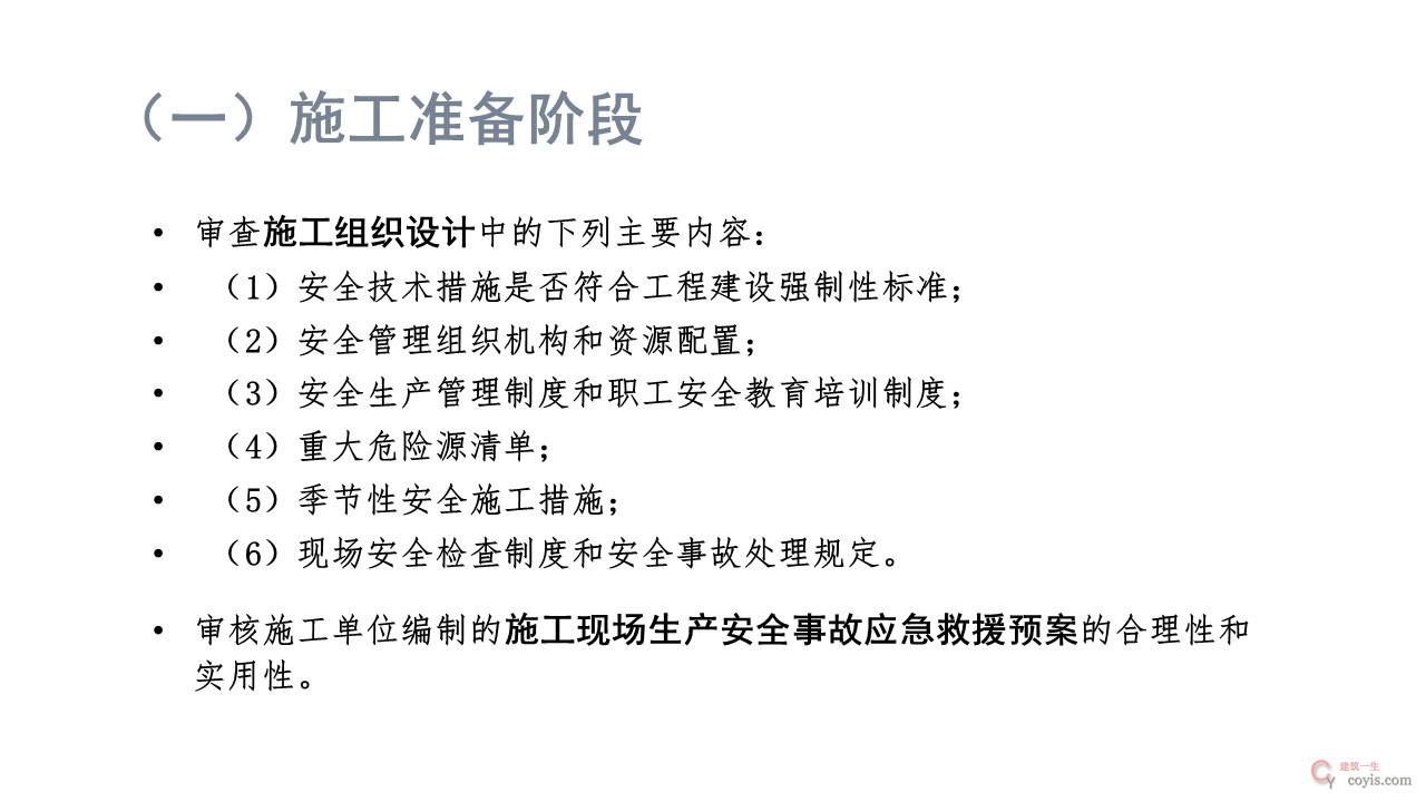 5)审核施工单位编制的施工现场生产安全事故应急救援预案的合理性和实用性。