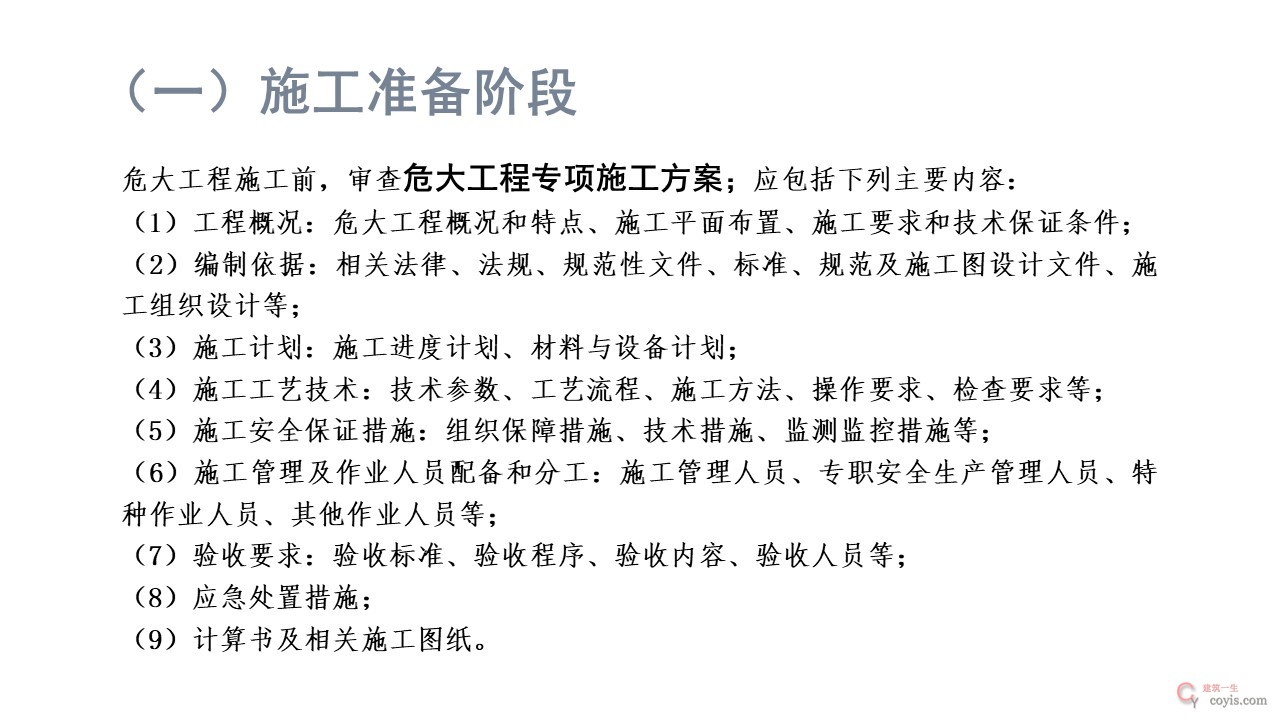 6)危大工程施工前,审查危大工程专项施工方案;应包括下列主要内容: