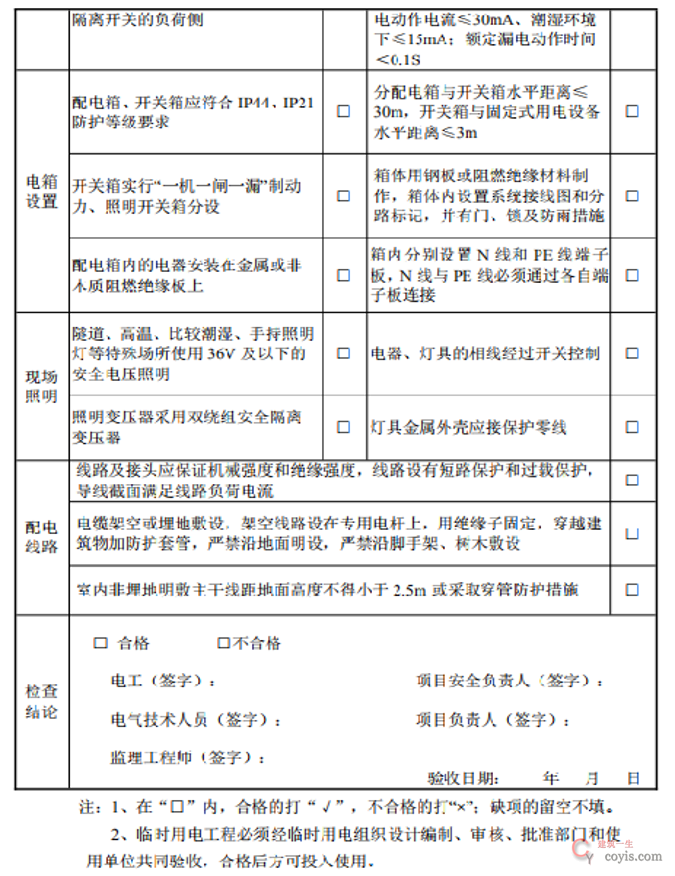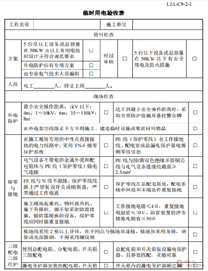 施工现场临时用电必须由施工总承包单位组织相关单位及相关人员验收,合格后方可使用,并填写表LJA-C9-2-1。监理工程师对验收资料及实物进行检查并签署意见。