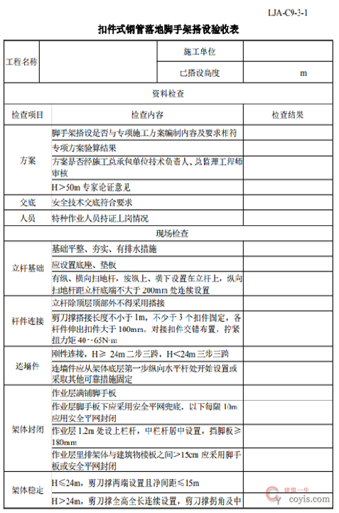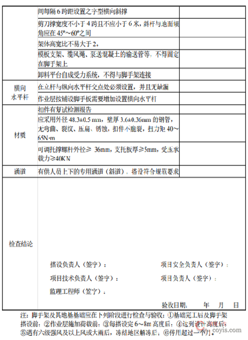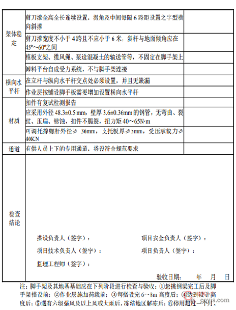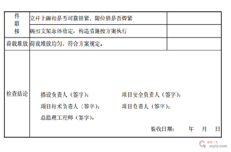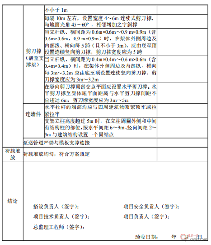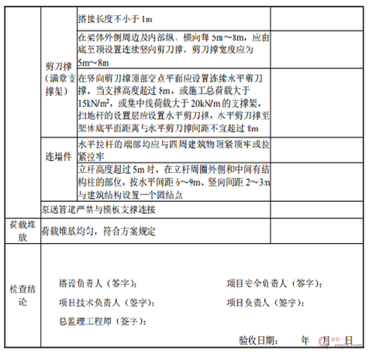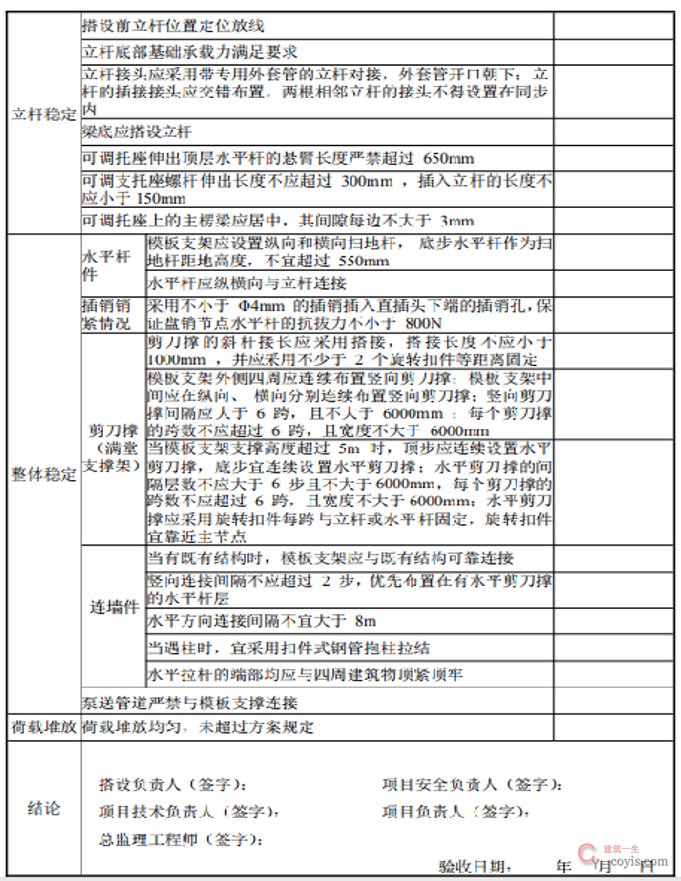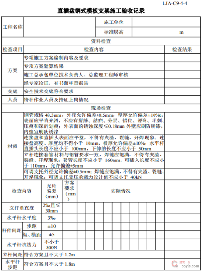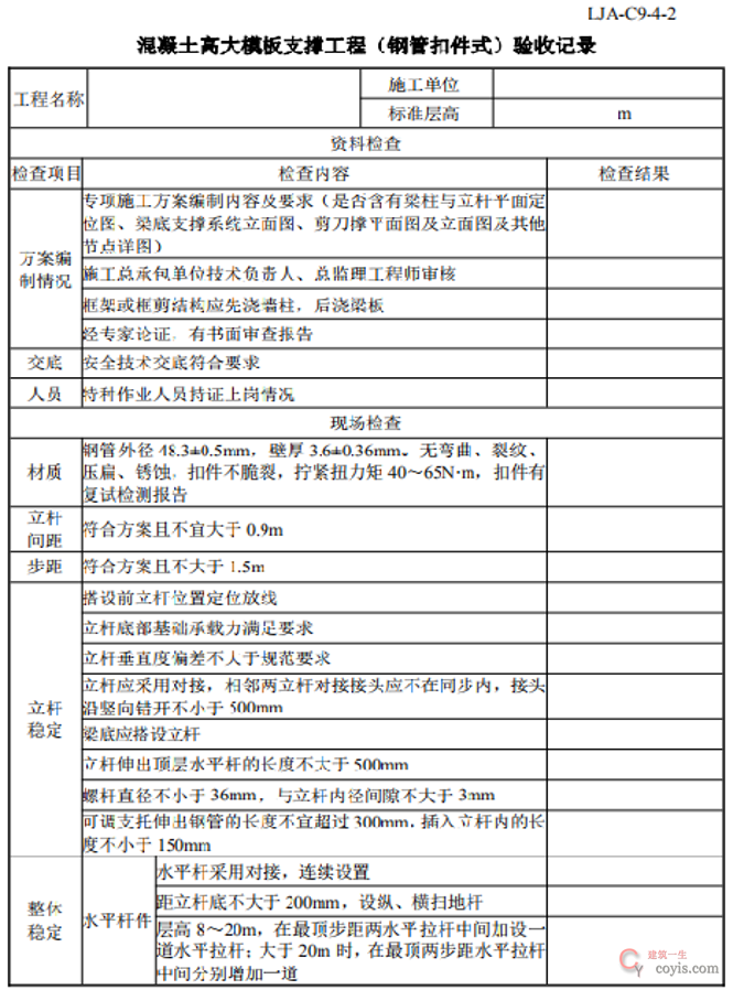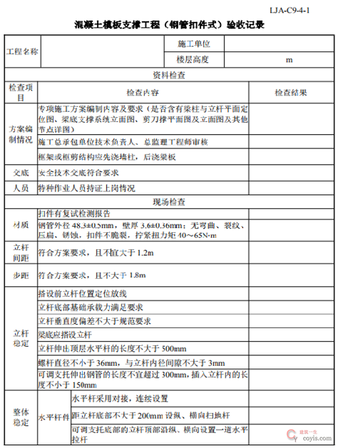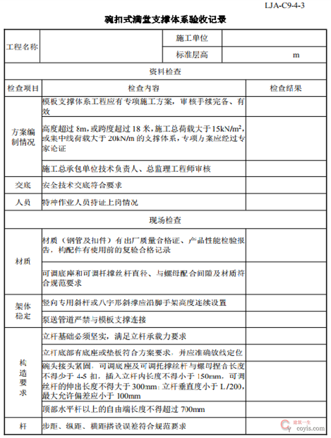 模板支撑工程验收记录包括:混凝土模板支撑工程(扣件式钢管脚手架)验收记录;混凝土高大模板支撑工程(扣件式钢管脚手架)验收记录;碗扣式满堂支撑体系验收表;直插盘销式模板支架施工验收记录。