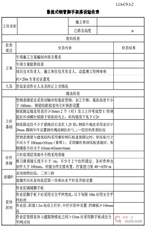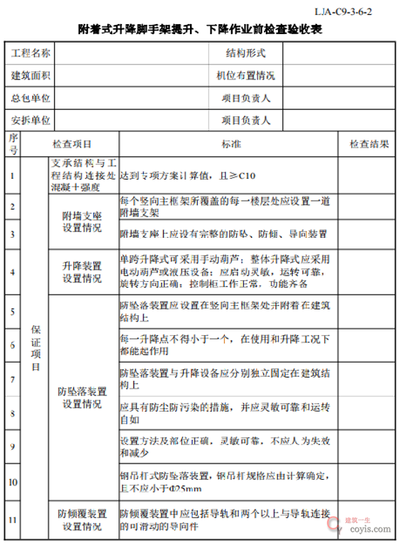 外挂式防护架验收内容包括:方案、人员、架体材质、架体加工、架体防护、支架安装、架体提升、荷载。应按表LJA-C11-3-1进行验收。