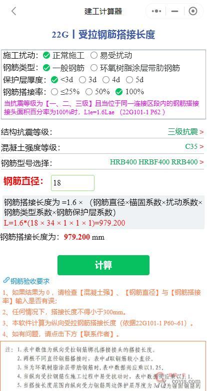 钢筋直径:18mm计算式结果:L=1.6×(18×34)=979.20