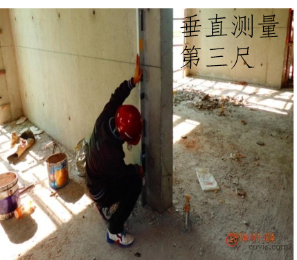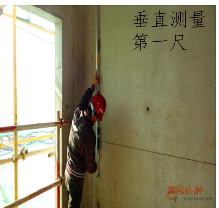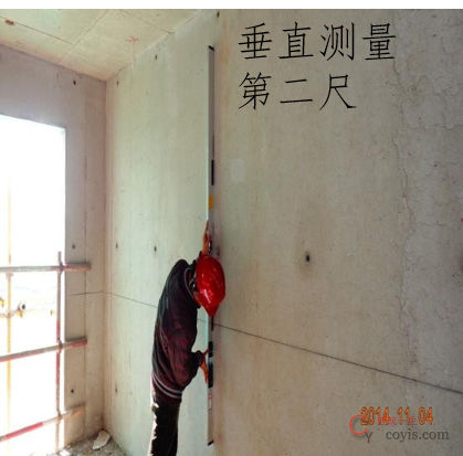 (3)施工层放线精度:用卷尺测量主轴线和施工层控制线(承重墙、柱边线)之间的距离与设计值进行比较,其偏差值是否符合标准要求。