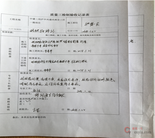为使混凝土问题处理工作做到程序化,规范化,制度化,确保问题处理质量,不留质量隐患,项目部从拆模手续,排查拆模部位砼问题,砼问题检查记录,到砼问题评定、确定修补方案,最后到砼问题修补完成,整个问题处理工作有专门管理人员和质量管理计划制度,形成制度化管理,每道问题修补工序严格按照“三检制度”进行检查,并做好检查记录。