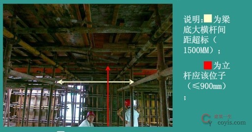 2)支模架不设扫地杆,立、横杆间距过大,防滑保险扣件未扣,上部不设纵横水平杆;