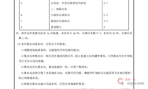 (5)临时排水沟内水的流速不宜大于后表的要求。必要时,在下列地段或部位应对沟底和边坡采取。临时加固措施:土质松软地段;流速较快,可能遭受冲刷地段;跌水处;地面水汇集流人沟内的部位;出水口处。