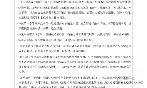 (11)在地下水位高而采用板桩作支护结构的基坑内抽水时,应注意困板桩的变形、接缝不密或桩端处透本等原因而渗水量大的可能情况,必要时应采取有效措施堵截板桩的渗漏水,防止因抽水过多使板桩外的土随水流人板桩内.从而淘空板桩外原有建(构)筑物的地基,危及建(构)筑物的安全。